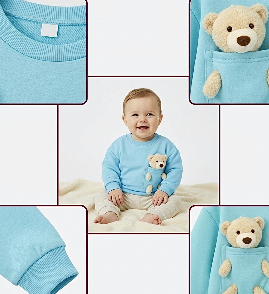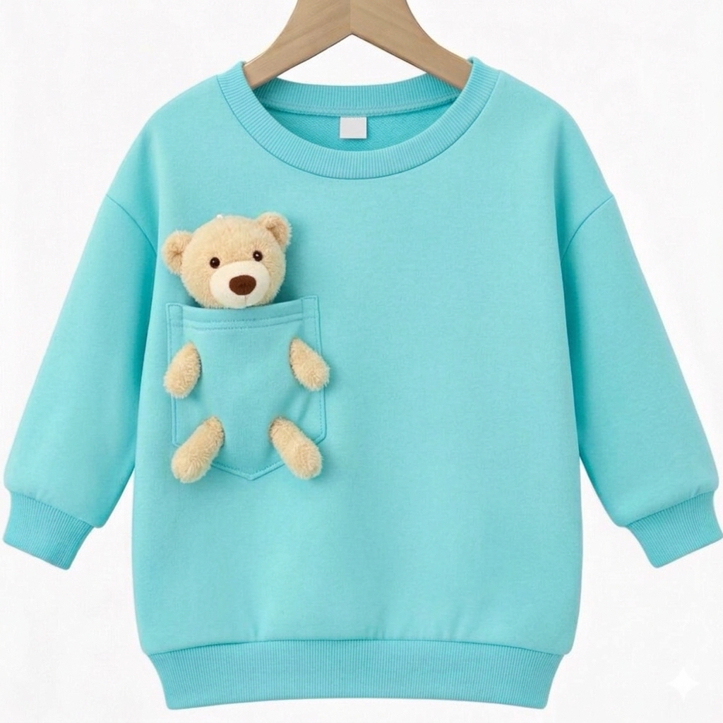 Bavlněná mikina blankytně modrá s hračkou. Plyšák bydlí v kapse s tlapkami prostrčenými ve vyšitých otvorech a je vyndavací na hraní. Naše produkty získaly patent pro celou EU, jsme jediný výrobce.