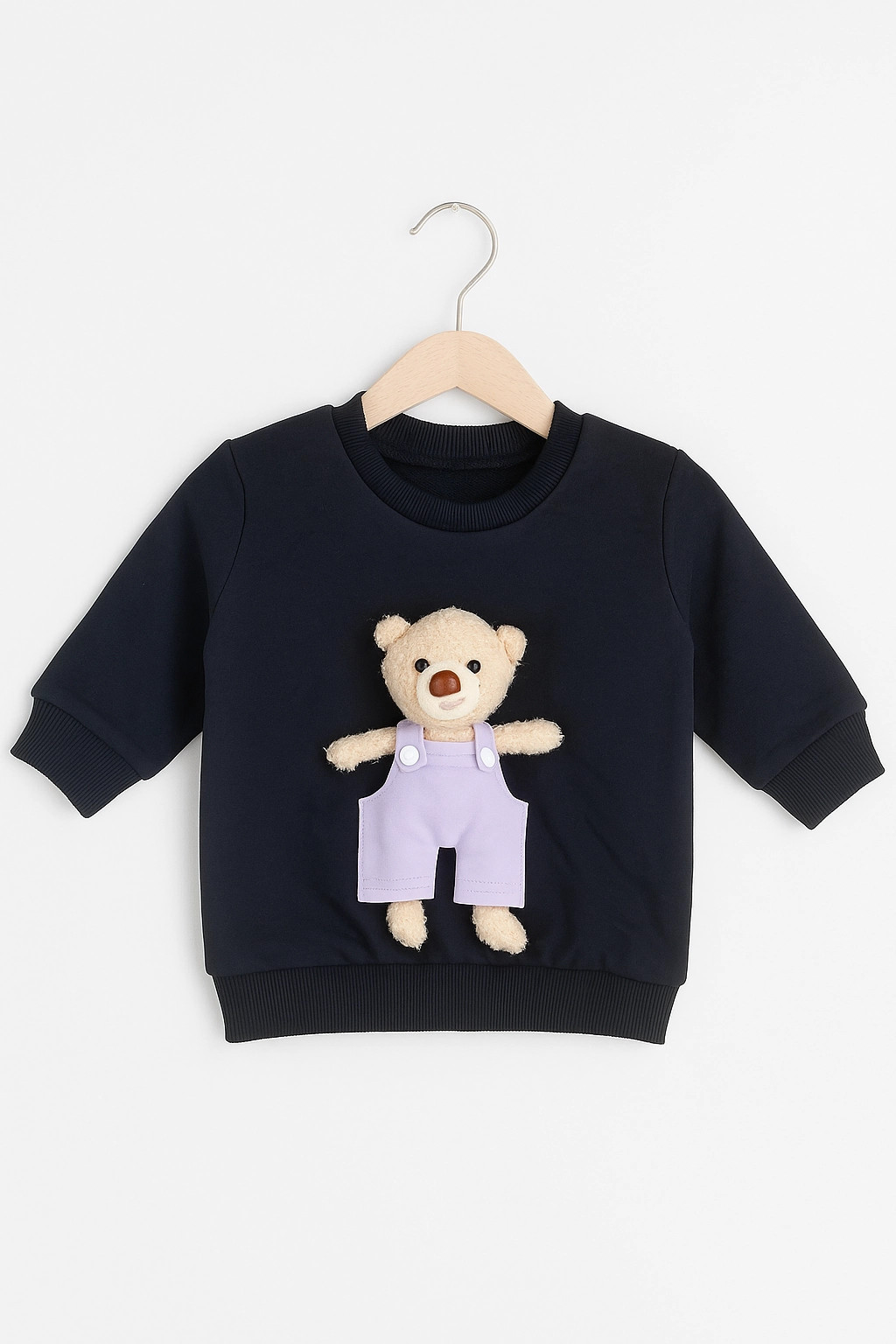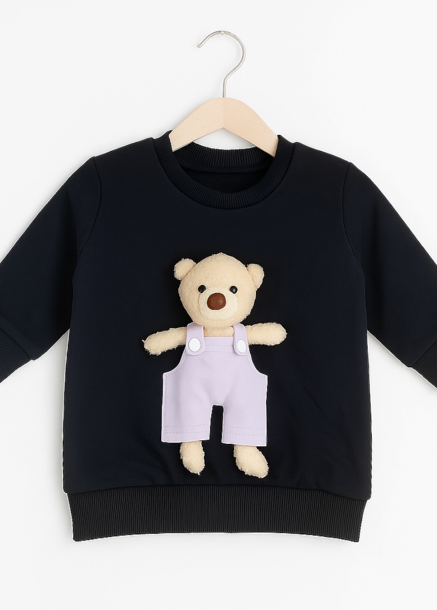Dětská bavlněná černá mikina s plyšovým medvídkem v lacláčích. Plyšák je vyndavací na hraní. Světově unikátní produkt z české rodinné firmy. Kšandy jsou rozepínací, což přináší další interaktivní zábavu pro dítě. Složení – 95 % bavlna, 5 % elastan, 250 g/m² s certifikací OEKO-TEX®. Odešleme ihned i na Slovensko, do 2 dnů máte doma. Můžete si i přikoupit Hračku na střídačku.