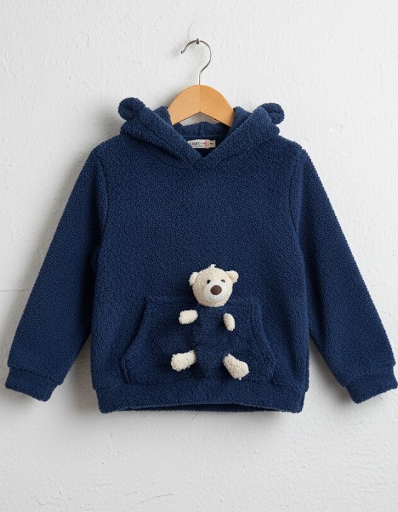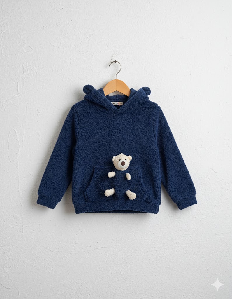 Poslední kus 122/128. Plyšová, měkká mikina v tmavě modré barvě s plyšovým medvídkem v ceně. Plyšák bydlí v kapse v obšitých dírkách, děti si hračku vytáhnou a hned si mohou hrát. Odešleme ihned, do 2 dnů máte doma. Rozměry: 122/128 - rukáv délka od krku 55 cm, délka mikiny 50 cm, š. 44x2