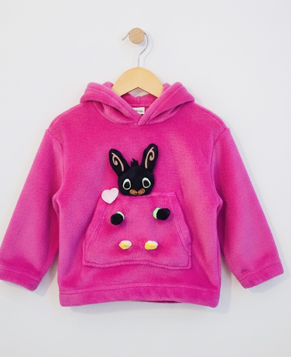 Fuchsiová mikina z jemného plyše s klokaní kapsou a plyšákem. Odesíláme s Bingem, pokud chcete jiného plyšáka, napište do poznámky v objednávce, odešleme dle vašeho přání. Plyšák je v ceně, bydlí v kapse v obšitých dírkách, děti plyšáka vytáhnou a hned si mohou hrát. Odesíláme hned i na Slovensko, do 2 dnů máte doma.
