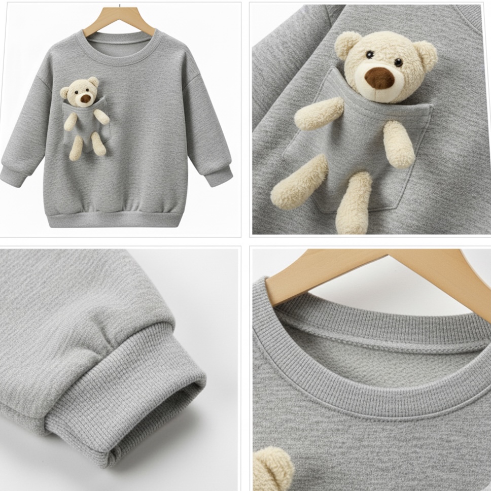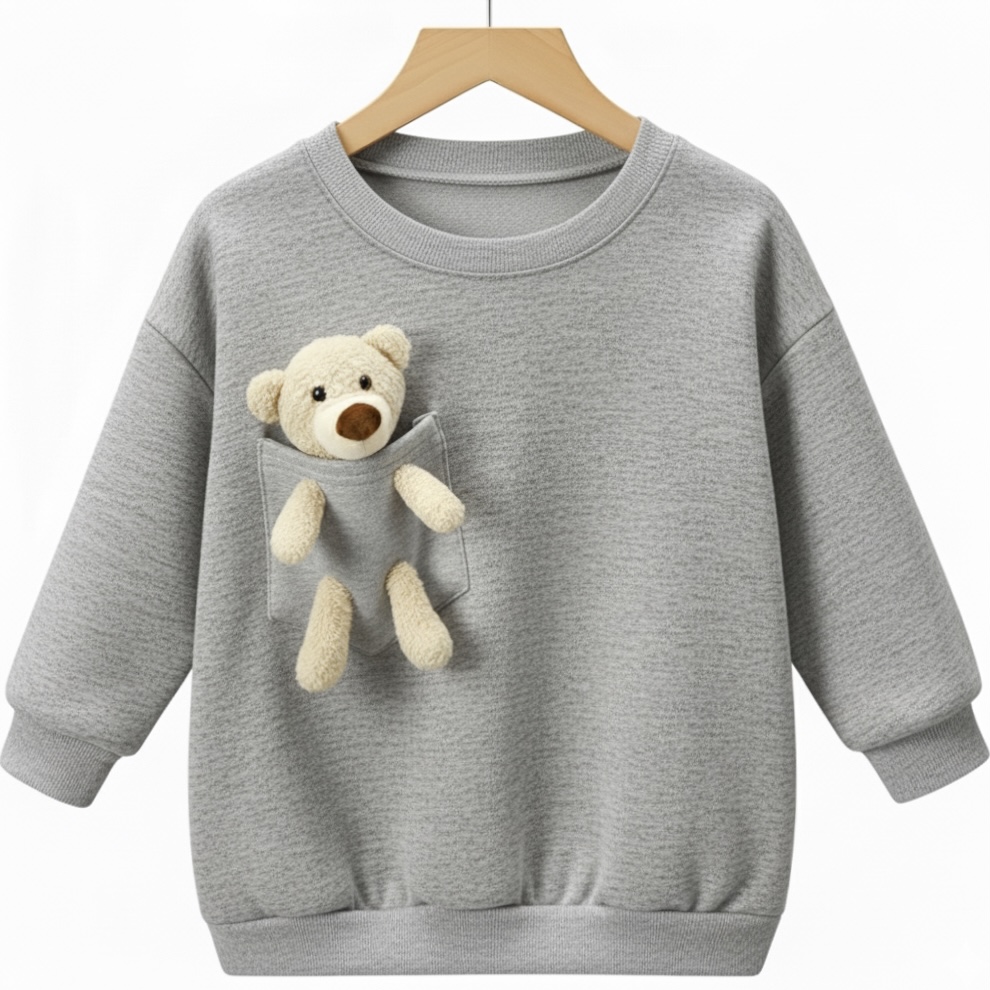 Bavlněná mikina v barvě šedý melír s vyndavací hračkou v ceně. Medvídek bydlí v kapse s tlapkami ve vyšitých otvorech a je vyndavací na hraní. Poctivá česká výroba v rodinné firmě. Naše produkty získaly patent pro celou EU, jsme jediný výrobce. Složení 95 % kvalitní bavlna a 5 % elastan, krásná gramáž 265g/m2. Odešleme ihned i na Slovensko, do 2 dnů máte doma. Velikostní tabulka mikiny s hračkou Výrobce: HračkOblečky. Stav: Skladem.