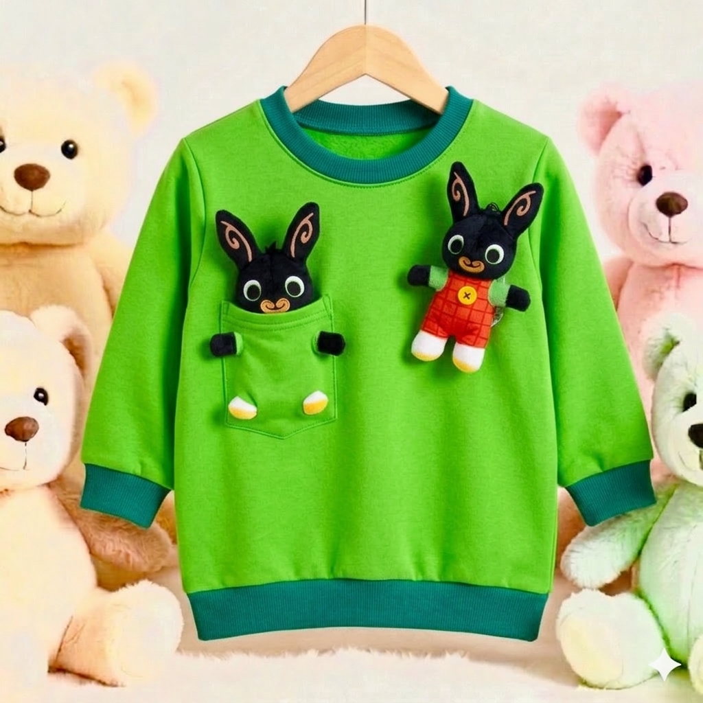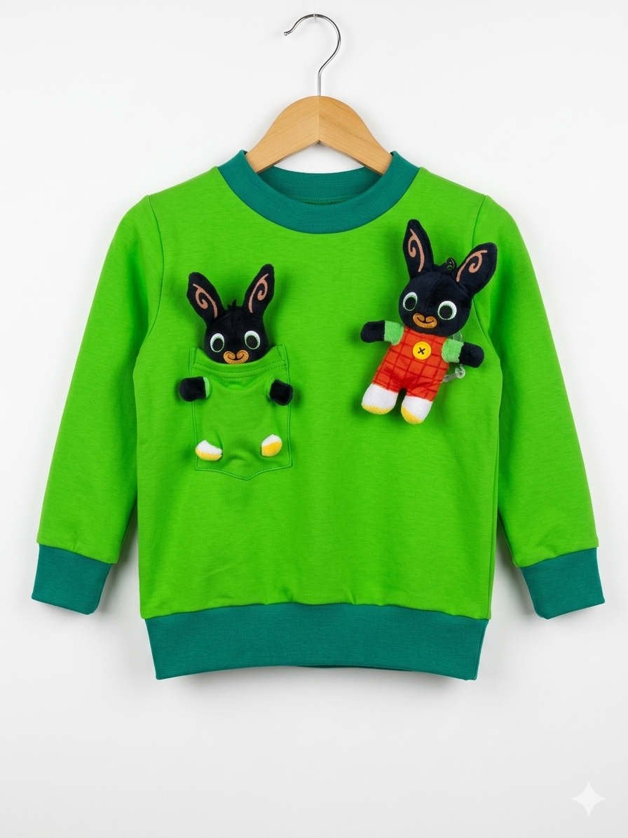 Bavlněná mikina v zelené barvě s vyndavací hračkou v ceně. Králíček Bing, jehož podobu vidíte na fotce, bydlí v kapse s tlapkami ve vyšitých otvorech a je vyndavací na hraní. Poctivá česká výroba v rodinné firmě. Složení 95 % kvalitní bavlna a 5 % elastan, 250g/m2. Odešleme ihned i na Slovensko, do 2 dnů máte doma.