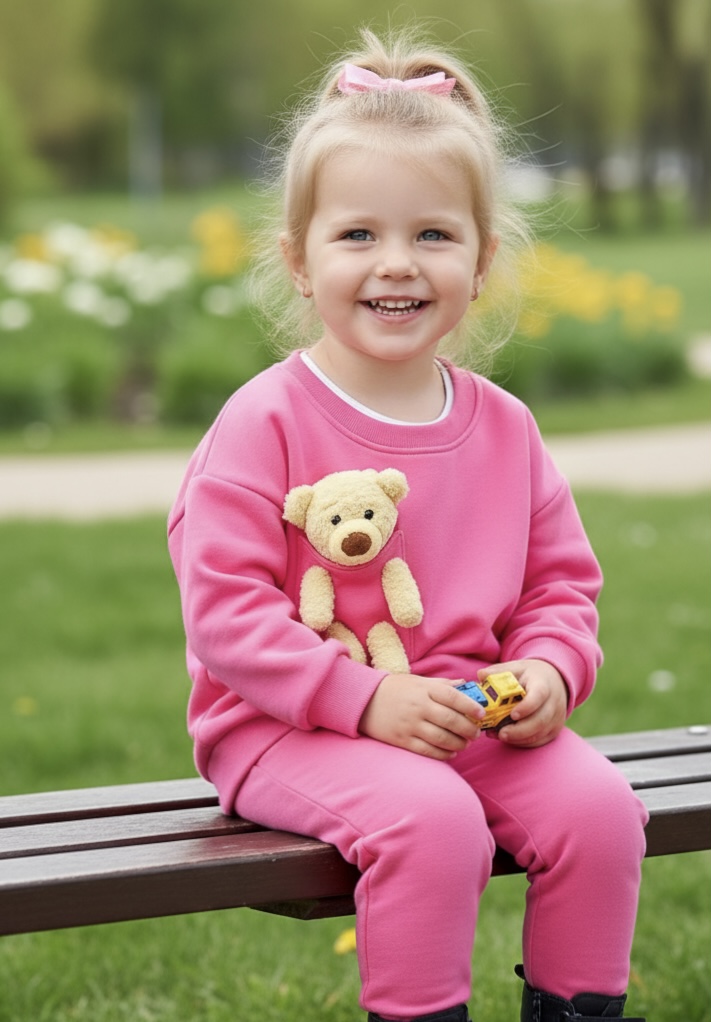 Bavlněná teplá mikina v růžové barvě s vyndavací hračkou v ceně. Medvídek bydlí v kapse s tlapkami ve vyšitých otvorech a je vyndavací na hraní. Poctivá česká výroba, velikosti sedí. Naše produkty získaly patent pro celou EU, jsme jediný výrobce. Složení 90 % kvalitní počesaná bavlna a 10 % pes, skvělá gramáž 280 g/m2. Odešleme ihned i na Slovensko, do 2 dnů máte doma.