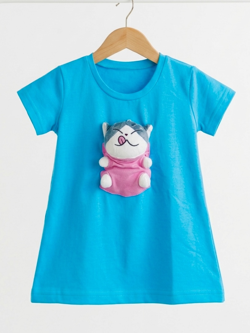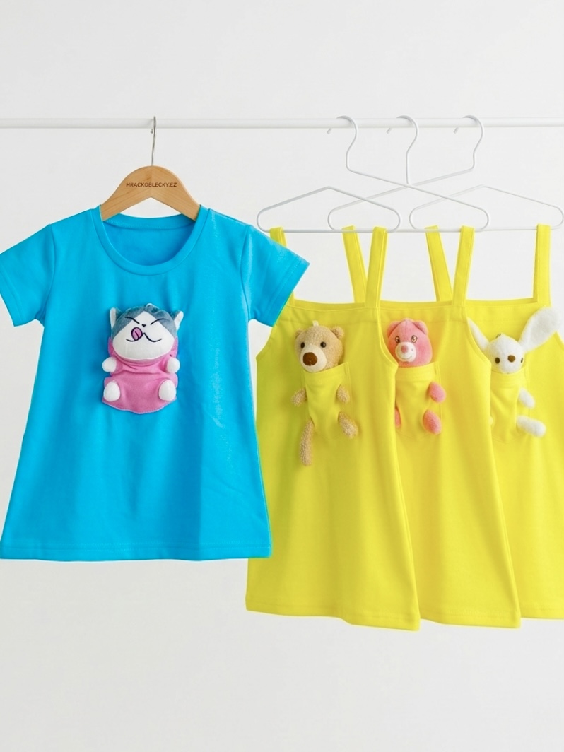 Tyrkysovo- růžové šaty s krátkým rukávem, s kapsičkou a hračkou. Plyšová kočička je v ceně a je vyndavací na hraní. Šaty jsou velmi příjemné na nošení, bavlna 95 % a elastan 4 %. Skladem. Odesíláme ihned.Rozměry - délka od ramene: 92/98 - 46 cm