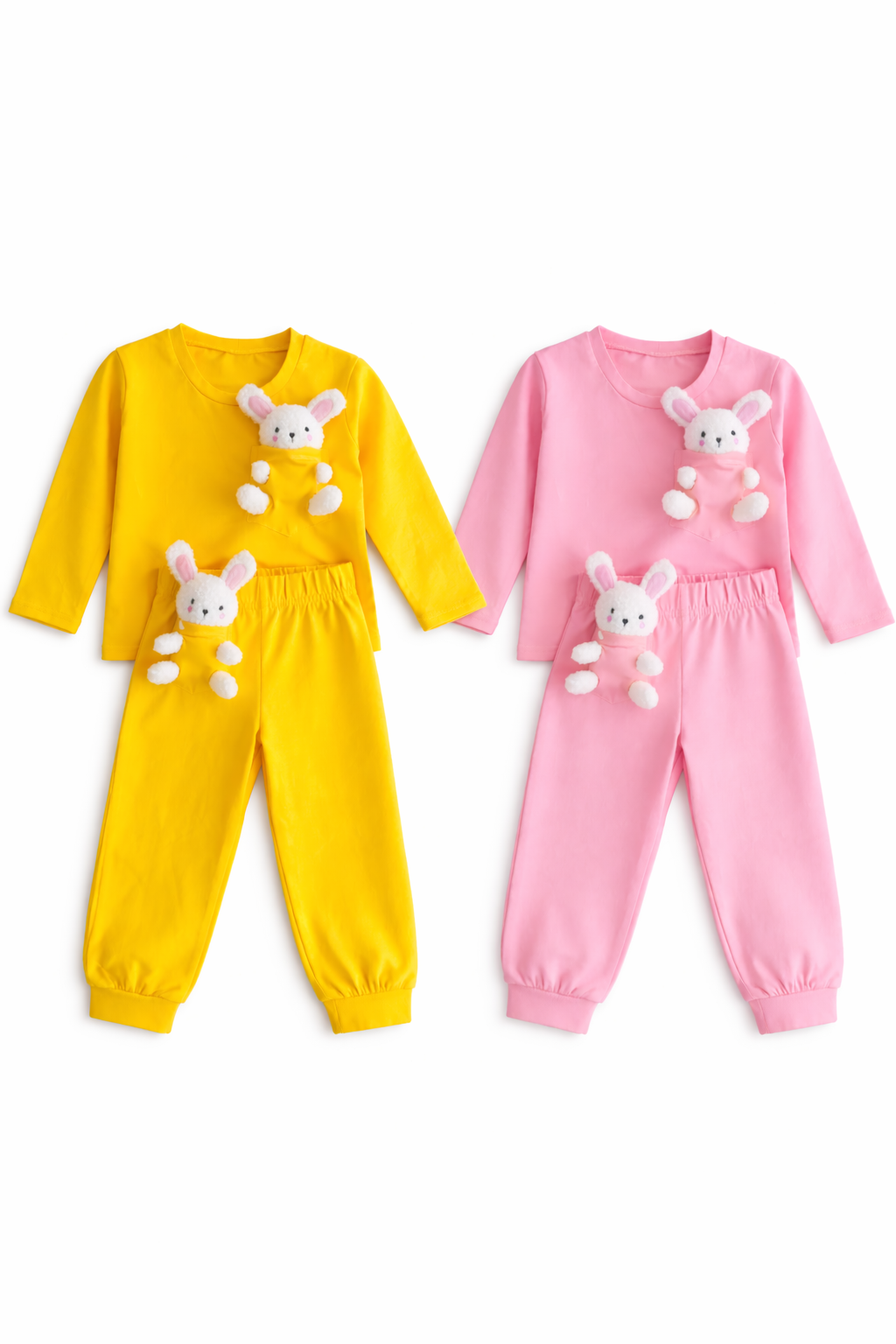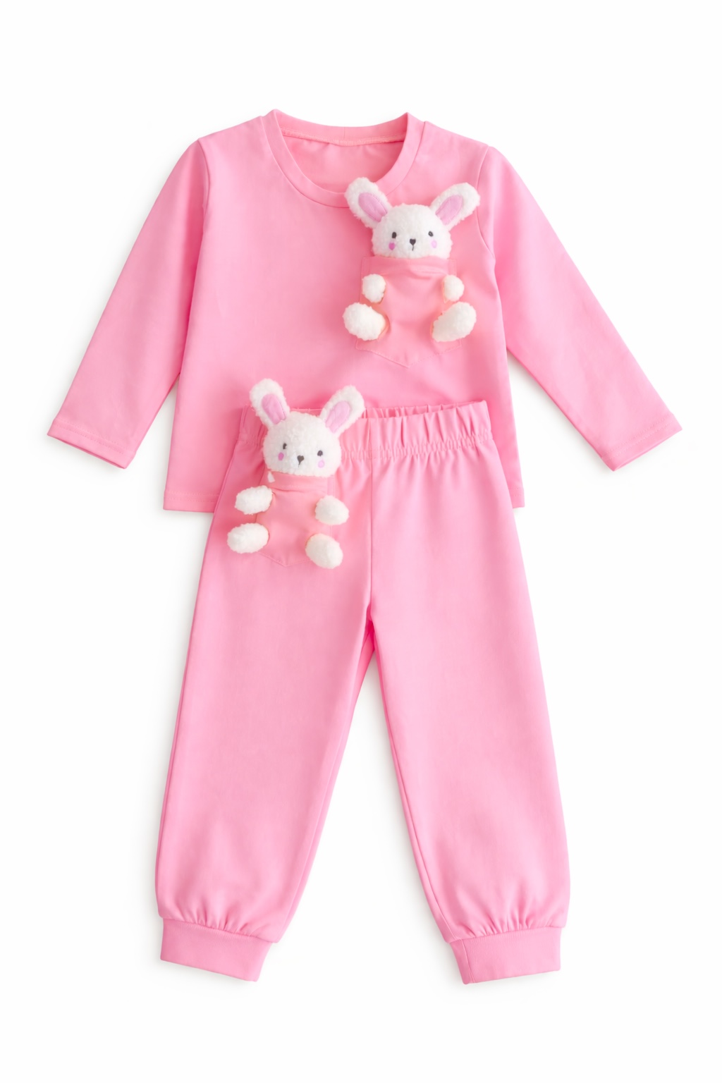 Poslední kus 122/128.  Roztomilá a pohodlná růžová zajíčková dětská souprava. Set obsahuje triko s dlouhým rukávem a kalhoty na gumu v totožném odstínu. Součástí jsou 2 roztomilí plyšoví kamarádi bydlící v kapsách s vyšitými otvory a jsou vyndavací na hraní.  Materiál: 95 % bavlna, 5 % elastan. Gramáž: 210 g/m². Certifikace: Oeko-Tex Standard 100. Výrobce: HračkOblečky. Stav: skladem