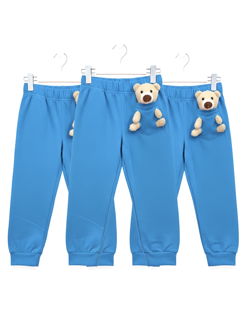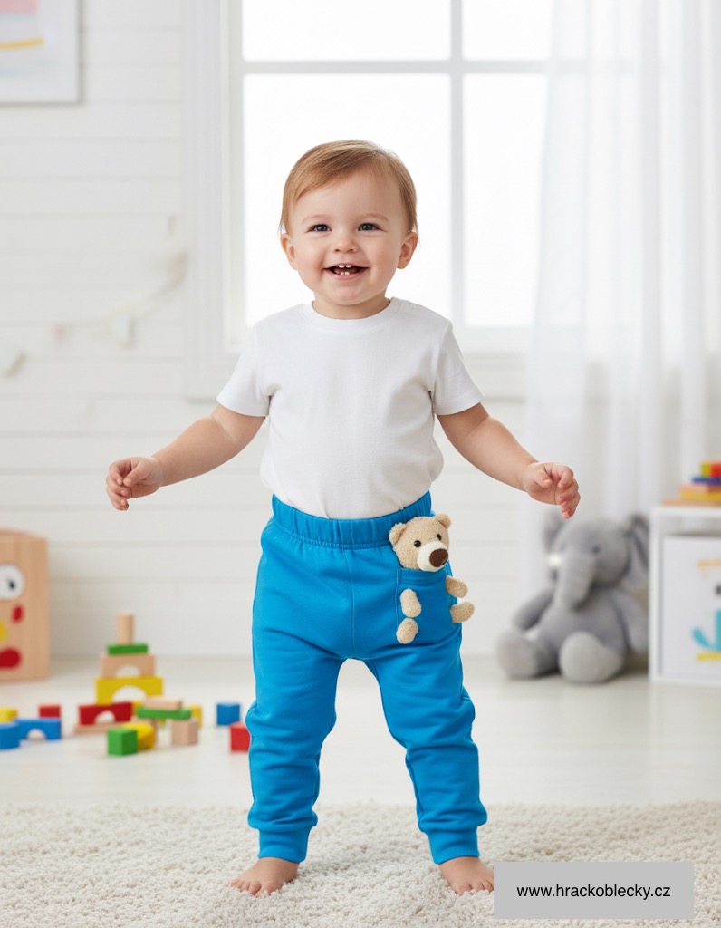 Jedinečné modré tepláky s hračkou. Jsou z kvalitní bavlny 95 % a 5 % elastan, v pase na gumu, certifikát kvality Oeko-Tex. Plyšový medvídek bydlí v přední kapse ve vyšitých otvorech a je vyndavací na hraní. Vše skladem, odešleme ihned i na Slovensko, do 2 dnů máte doma. Výrobce: HračkOblečky