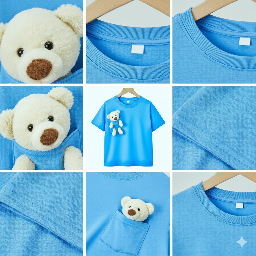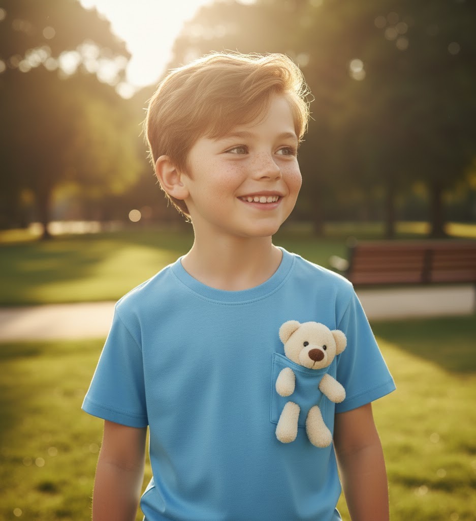 Dětské bavlněné modré tričko s krátkým rukávem a vyndavací hračkou - plyšovým medvídkem v ceně. Složení triko 95% kvalitní bavlna, 5% elastan, 200g/m2, certifikát kvality Oeko-Tex. Velikosti odpovídají, poctivá česká výroba. Odesíláme ihned i na Slovensko. Výrobce: HračkOblečky. Stav: skladem